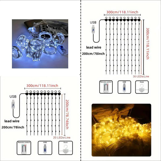 Χριστουγεννιάτικη κουρτίνα Led με διάφανο πλαστικό καλώδιο 3χ3m,3x2m 2χ2m και πρόγραμμα οχτώ μοτίβων